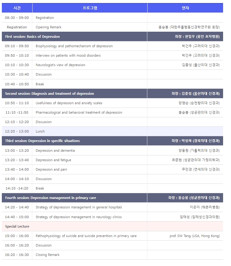이번 학술대회 주제는 Depression management and suicide prevention in neurological disorders and primary care(신경계 장애 및 1차 진료에서의 우울증 관리 및 자살 예방)로 마련됐다.