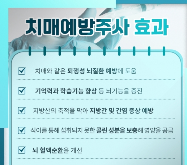 최호진 교수는 “치매를 예방하는 검증된 약제나 주사는 없다. 뇌기능 개선에 대한 일부 효과가 있는 성분을 치매예방주사로 둔갑시킨 부분은 주의가 필요하다”고 말했다.