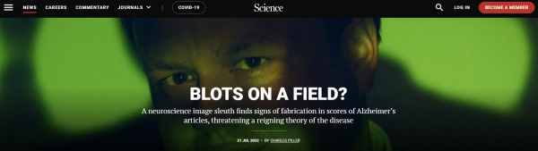 그런데, 최근 이러한 분위기에 다시 한 번 찬물을 끼얹는 이슈가 터져 나왔다. 지난 21일(현지시간) 국제학술지 '사이언스(Science)'에는 베타 아밀로이드 가설 검증 논문에 이미지 데이터가 조작됐다는 주장이 제기된 것이다.