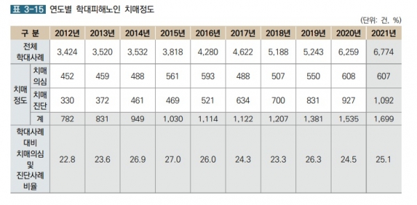 치매의심 및 진단을 받은 학대피해노인의 증가세도 두드러진다. 지난 2012년 782명이던 피해노인은 2016년 1,114명으로 늘었고, 2021년에는 1,699명까지 증가했다.