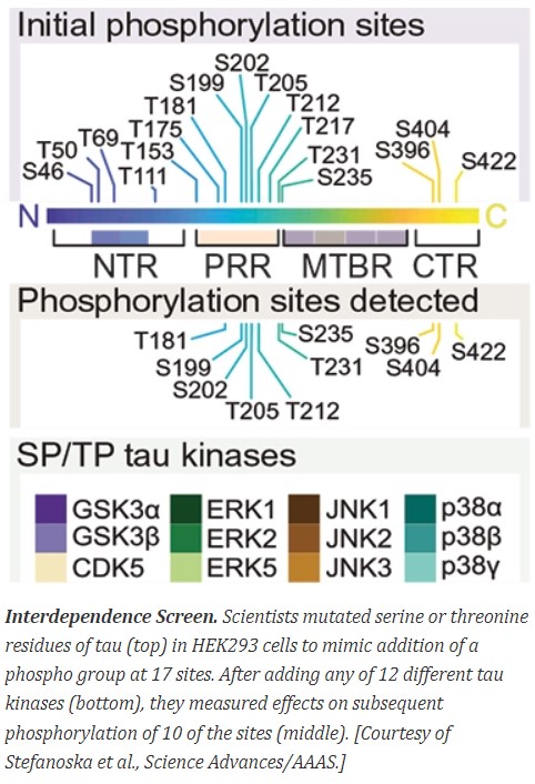 연구자들은 인간의 타우를 HEK293 신장세포에 발현시키고 GSK3β, CDK5와 ERK, JNK, MAP p38 등 12개의 인산화 단백질인 카이네이즈를 동시에 신장세포에 발현시켰다. 연구자들은 조직적으로 17개의 아미노산을 Ser은 Asp, Thr은 Glu으로 마치 인산화된 형태의 음성기를 가진 아미노산으로 바꾸었다. 그리고 그 치환 결과로 다른 아미노산 사이트에 영향을 미치는지 조사는 이 방대한 실험은 2,000 조합이 만들어지는 조직적(systemic) 실험이었다.