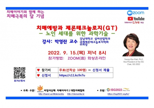 비영리단체 치매이야기가 주최하고 대한치매협회가 주관하는 '치매예방과 제론테크놀로지(GT)' 교육이 오는 15일 ZOOM(줌) 화상온라인으로 열린다.