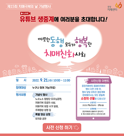 사전 신청은 오는 19일까지 누구나 무료로 가능하다. 접속 방법은 중앙치매센터 홈페이지를 통해 행사 팝업창을 클릭 후 사전신청 등록(링크)을 활용하면 된다.