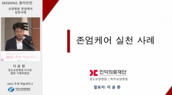이윤환 경도요양병원 이사장(대한요양병원협회 기획위원장)은 28일 열린 대한요양병원협회(회장 기평석) 추계학술세미나에서 '요양병원 존엄케어 실천사례'를 발표했다.