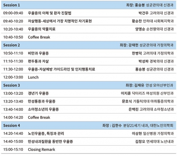 학술대회에서는 우울증의 이해 및 환자 진찰법부터 우울증-자살예방 가이드라인 및 인지행동치료, 만성내과질환을 동반한 우울증 등 다양한 주제로 발표가 진행될 예정이다.