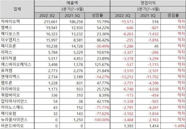 이외에도 아리바이오(영업손실 67억 원), 메디포스트(63억 원), 펩트론(38억 원), 퓨쳐켐(35억 원), 뉴라클사이언스(35억 원), 네이처셀(34억 원), 라파스(33억 원), 메디포럼(31억 원), 카이노스메드(28억 원), 압타머사이언스(13억 원), 메디프론(13억 원) 등이 영업에서 손실이 발생했다.