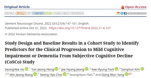 최근 창원한마음병원 신경과 호성희, 이화여대 서울병원 신경과 정지향 교수 등은 치매학회지를 통해 '주관적 인지저하 연구에서 경도인지장애 또는 치매로의 임상적 진행에 대한 예측 변수를 식별하기 위한 코호트 연구의 연구 설계 및 기준 결과'를 공개했다.