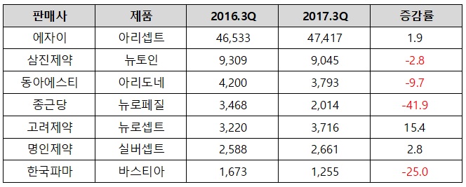 뉴로페질의 처방액은 가장 처참하다. 3분기 누적 처방액은 20억원으로 전년 34억원 대비 42%나 감소했다.