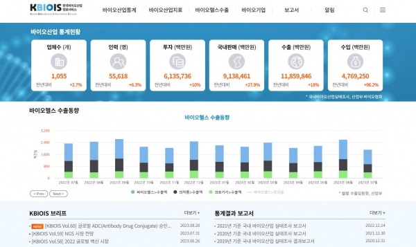 아울러, 산업통상자원부에서 매월 공표하는 바이오헬스 수출 동향 데이터를 반영하여 협회는 시각화 서비스를 신규 제공해 의약품 및 의료기기의 월별 수출 트렌드를 확인할 수 있도록 했으며, 매월 발간되는 KBIOIS 브리프를 통해서도 글로벌 바이오산업의 최신 동향을 파악할 수 있다.