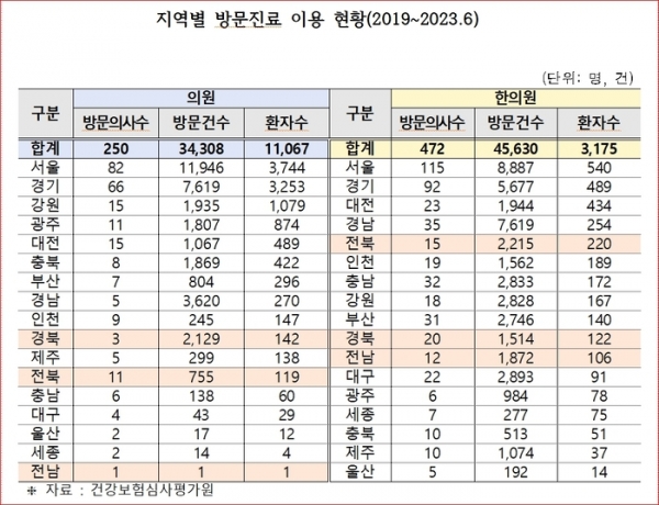 반면 시범사업에 참여한 의사는 전남이 13명(의원 1명, 한의원 12명), 경북 23명(의원 3명, 한의원 20명), 전북 26명(의원 11명, 한의원 15명)에 그쳤다.