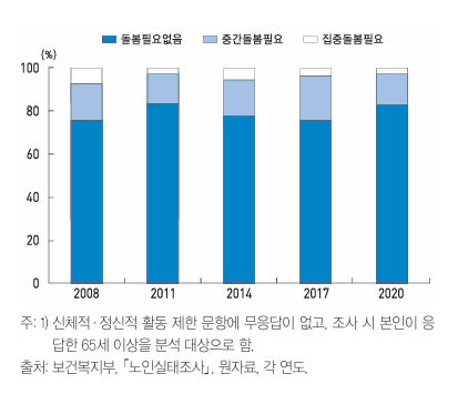조사 연도별로 변동은 있지만 약 75~80%의 노인이 ‘돌봄 필요 없음’에, 15~20%는 ‘중간 돌봄 필요’에, 그리고 3~7%는 ‘집중 돌봄 필요’에 해당된다.