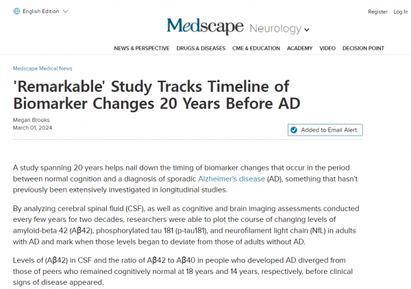 뇌척수액에 존재하는 물질이 알츠하이머병의 조기 진단을 위한 바이오마커로 사용될 수 있다는 결과를 20년간의 연구로 밝혀냈다. 이 연구는 의학 저널 ‘뉴잉글랜드저널오브메디슨’(The New England Journal of Medicine) 2월 21일 자 온라인판에 실렸다.