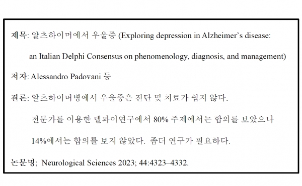 그러다 알츠하이머병에서 항우울제에 관한 강의를 준비하며 이 논문을 읽고 나서야 이해할 수 있게 됐습니다. 그때 제가 느낀 것은 요즘 학생들은 참 고단하겠구나, 반백 년을 살아온 나도 ‘델파이 연구’는 처음 듣는 내용인데, 영어를 잘하려면 많은 것을 알아야 하는 구나, 하는 생각이 들었습니다. 결론적으로 이 논문의 내용은 알츠하이머병이 우울증과 연관이 있고, 그 증상은 일반적으로 젊은 사람에서 보이는 주요 우울증 증상과 다르며, 치료는 우선적으로 선택적 세로토닌 흡수억제제를 사용하는 것을 권장한다는 것이었습니다.