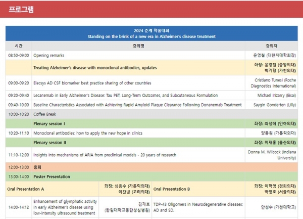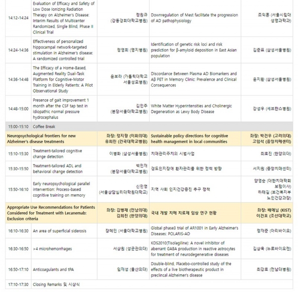 이번 춘계학술대회에서는 레카네맙과 도나네맙의 효과와 부작용, 임상 시 고려 사항, 부작용인 ARIA의 발생기전 등 아밀로이드 항체 치료제를 전반적으로 고찰하는 프로그램이 진행된다. 우리나라는 올해 9월이나 10월경에 레카네맙의 사용 승인이 기대되기 때문에 향후 치료를 위한 준비 시기라는 점에서 시의성 있는 학술대회가 될 것으로 기대한다.