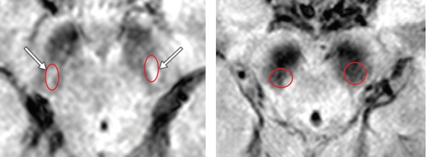 우선 파킨슨병으로 진행하지 않은 렘수면 행동장애 환자 7명의 경우 아무 질환도 없는 건강한 사람(비질환자)과 동일하게 뇌 MRI 사진에서 하얗고 동그스름한 부분(흑질의 구조물인 nigrosome)이 발견됐다.