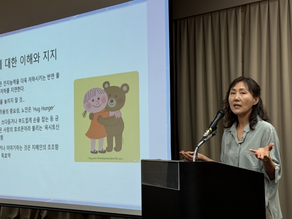 김동선 조인케어 대표는 ‘사람 중심 케어에 입각한 노인 돌봄’이라는 제목으로 치매에 걸릴까 두려운 세상이 아닌 치매에 걸려도 괜찮은 세상을 준비해야 하며, 치매를 돌보는 사람의 입장만 고려하고 정작 치매 당사자에 관한 관심이 부족한 현실을 꼬집었다. 서비스 대상자로서 치매 어른을 보지 말고, 임종을 앞둔 말기까지 즐겁고 의미 있는 시간을 보내게 하는 사람 중심 케어의 내용을 전했다. 특히 최근 국내 판매가 승인된 비싼 약값의 레켐비보다 치매를 이해하고 증상 진행 지연 효과가 확실한 생활 개선, 치매 친화적 환경 조성이 효과적임을 언급했다. 그동안 의료적 관점으로 치매를 봐왔지만, 점차 사회심리학적 관점으로 바뀌어야 함을 강조했다.