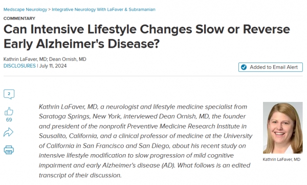 뉴욕 사라토가 스프링스의 신경과 전문의이자 생활 습관 의학 전문가인 캐서린 라파버(Kathrin LaFaver) 박사는 캘리포니아 대학교 의과대학 임상교수 딘 오니쉬(Dean Ornish) 박사와 경도인지장애와 초기 알츠하이머병(AD)의 진행을 늦추는 집중적인 생활 습관 개선에 대한 연구를 인터뷰했다. 다음은 지난 11일 <메드스케이프>(Medscape)에서 공개한 이들의 인터뷰 내용 녹취록이다.
