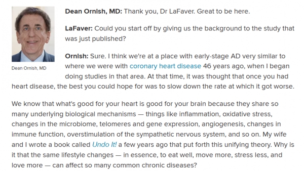 Ornish: 20주 후 무작위 대조 시험에서 처음으로 발견한 것은 약물 없이 집중적인 생활 습관 개입이 경도인지장애 또는 초기 알츠하이머병 환자의 인지 및 기능을 크게 개선했다는 것입니다.