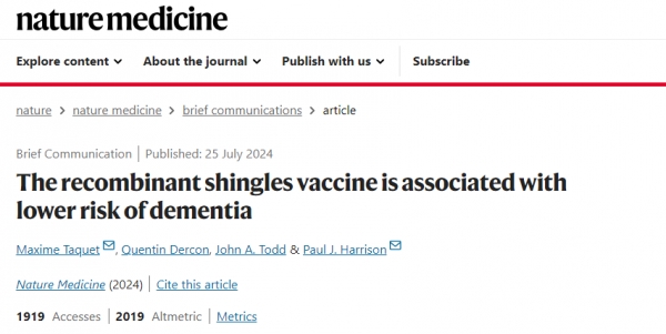 Taquet, M., Dercon, Q., Todd, J.A. et al. The recombinant shingles vaccine is associated with lower risk of dementia. Nat Med (2024). https://doi.org/10.1038/s41591-024-03201-5