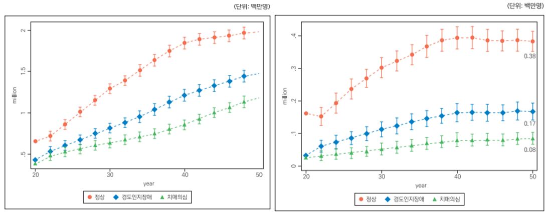 스웨덴과 미국 등에서 활용하는 미시모의실험 모형을 통해 추출한 데이터에 의하면 2050년 기준 치매 의심 1인 고령 가구는 119만 명에 달할 것이며, 이 중 약 8만 명이 치매가 의심되는 인지능력에도 경제활동에 참여할 것으로 예측했다. 경도인지장애도 148만 명에 달할 것으로 나타났다.