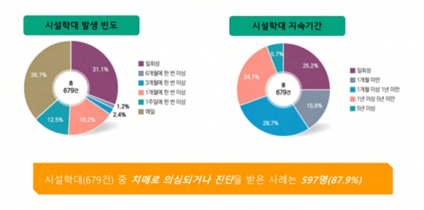 또한 시설 학대 679건 중 치매 환자 사례는 597명(87.9%)이었다. 학대 사례의 상당수가 치매 환자와 연관성이 있다.