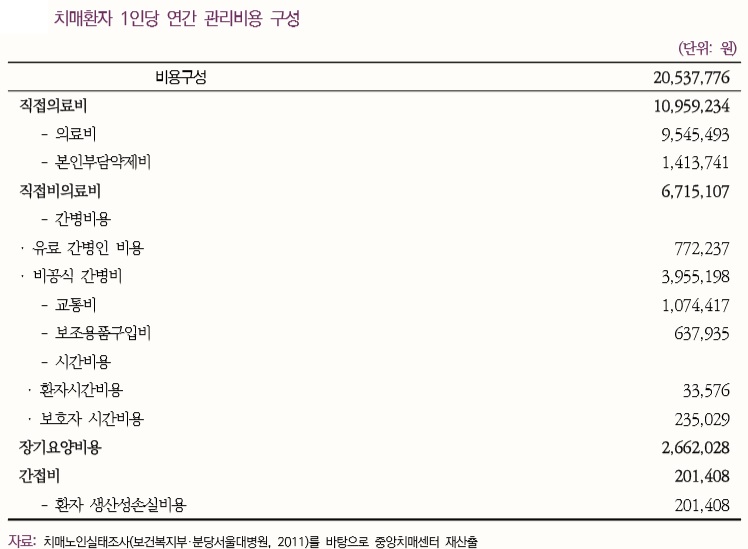 중증치매환자 1인당 관리 비용은 초기치매를 앓고 있는 환자보다 2배 이상이 소요되는 것으로 나타났다.