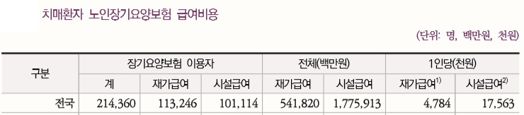 노인장기요양보험을 이용한 치매환자 급여비용은 재가급여가 5,400억원, 시설급여가 1조7,000억원으로 조사됐다.