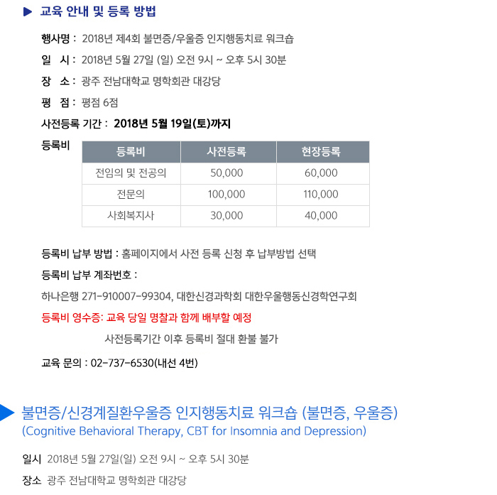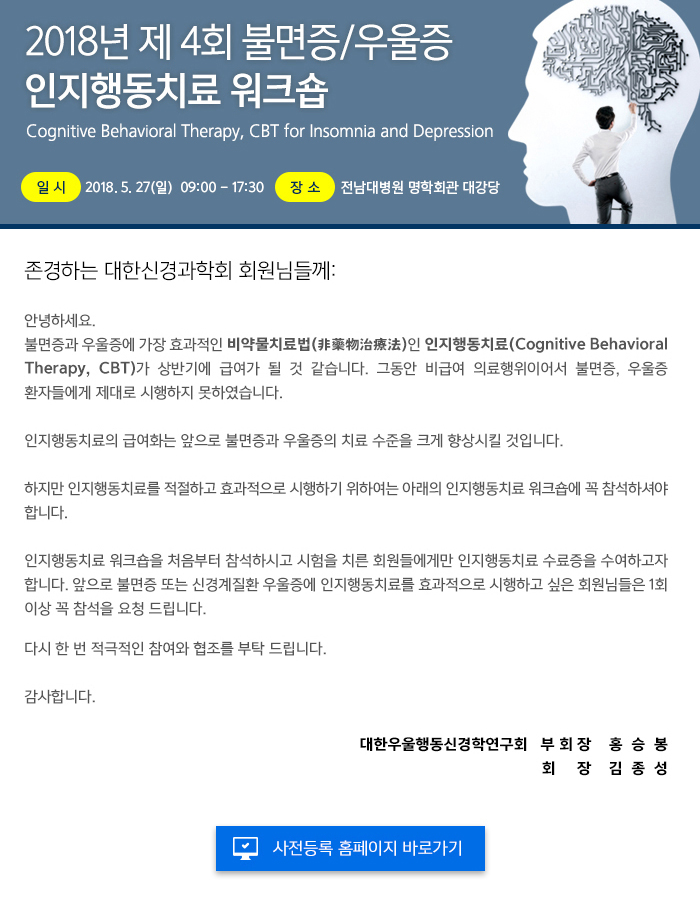 대한우울행동신경학연구회가 오는 27일 광주 전남대병원 명학회관 대강당에서 불면증 및 우울증을 주제로 인지행동 치료 워크숍 개최을 개최한다고 7일 밝혔다.