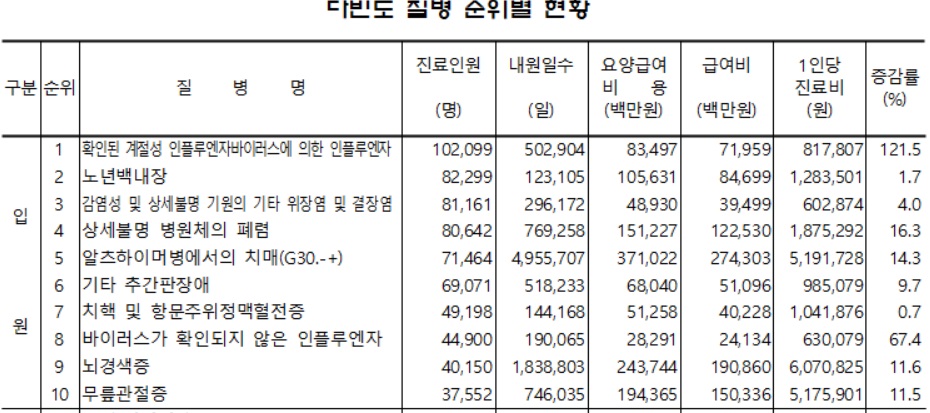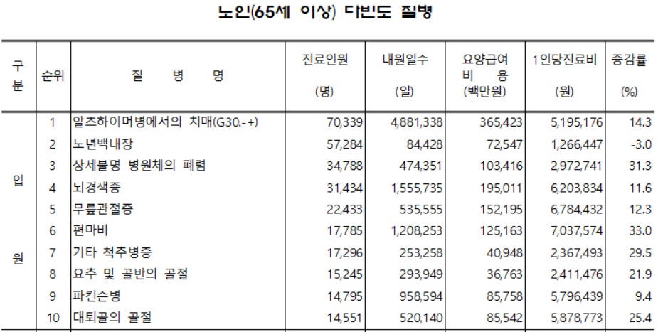 10위 내 질환 중 알츠하이머 치매는 증가율이 가장 높지 않았으나, 전체 요양급여에서 차지하는 비율이 가장 커 입원 진료비가 상승에 직접적인 영향을 미쳤다.
